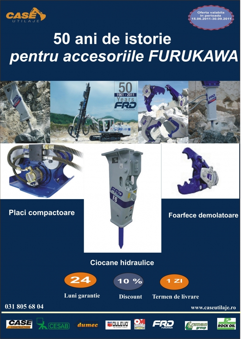 FURUKAWA un brand cu renume atat pe plan international cat si pe plan national a implinit de curand 50 de ani de la livrarea primelor sale produse, infiintarea primului sau sediu si apoi a multor alte filiale in lume. Pentru a incununa aceasta mare realizare Furukawa vine in perioada 15.06.2011 - 30.09.2011 cu o oferta speciala pentru toate accesoriile FRD - ciocane hidraulice, foarfece demolatoare,placi compactoare - si anume: 10 % discount pentru orice accesoriu achizitionat de la Case Utilaje Constructii Srl, 24 de luni termen de garantie si un termen "fulger de livrare", NUMAI 1 zi.