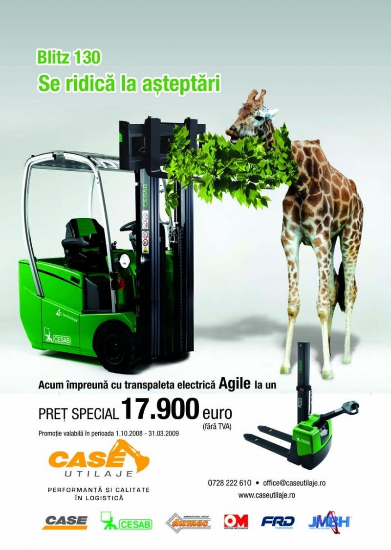 Contacteaza-ne in perioada 1 Octombrie 2008 - 31 Martie 2009 pentru a beneficia de pachetul de lucru format din Electrostivuitorul BLITZ 130 si Transpaleta electrica Agile la pretul special de 17.900 euro fara TVA.