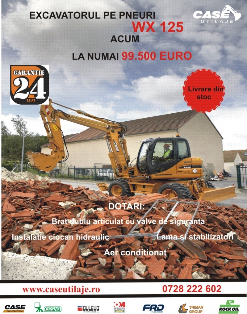 Profitati acum de oferta speciala Case si puteti achizitiona noul excavator pe pneuri WX 125 la numai 99.500 EURO. Si asta nu este tot. Acest model dispune si de serie de dotari precum - brat dublu articulat cu valve de siguranta, instalatie ciocan hidraulic, lama si stabilizatori, aer conditionat - toate incluse in pretul promotional de 99.500 EURO.