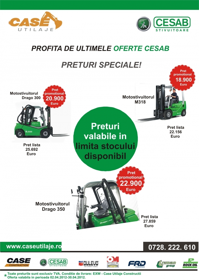 Astfel, numai acum puteti beneficia de avantajele acestor motostivuitoare si le puteti achizitiona incepand cu preturi de la 18.900 EURO. Preturile sunt valabile in limita stocului disponibil. Conditii de livrare: EXW- Case utilaje Constructii.